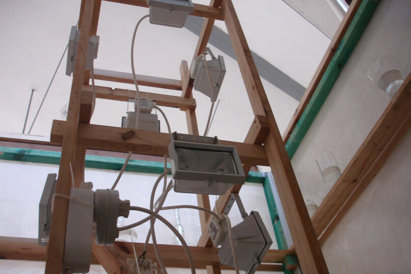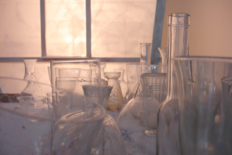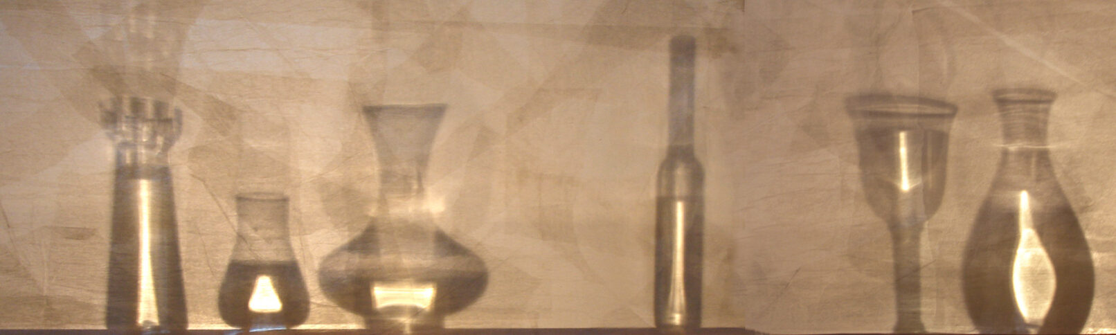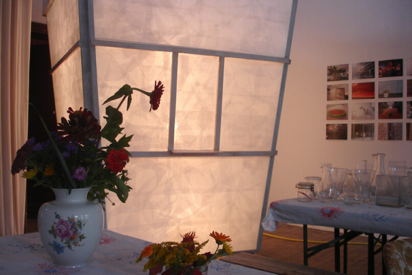 „Zauber gefrorenen Lichts“, ist ein Wort Wilhelm Wagenfelds über die Eigenschaften des Glases. Das Glas macht sichtbar gerade durch seine Immaterialität. Das Durchscheinende der mit Wasser gefüllten Vasen in Birgit Hampels Kiosk wirkt durch eine ihrerseits transluzente Konstruktion aus verklebtem Papier auf einer Holzkonstruktion mit vier sich nach oben öffnenden Wänden. Das Panoptikum wird von innen angestrahlt.