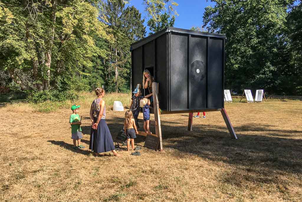 Parallel zur Foto-Ausstellung von Langzeitbelichtungen mit unterschiedlichen Lochkameras entstand die Installation einer begehbaren Camera Obscura.